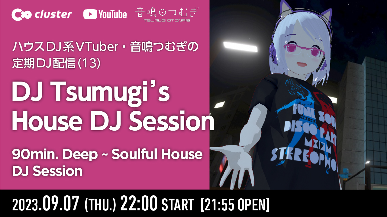 ハウスDJ系VTuber・音鳴つむぎの定期DJ配信は隔週木曜、スマホからでもアクセスできるVRプラットフォーム “cluster” でおこなわれます。今回は試験的にYouTubeに中継します。