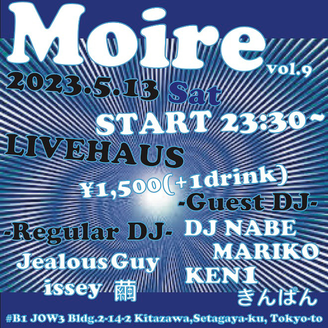 下北沢LIVEHAUSにて毎月開催中。テクノ・ハウスを軸にするが、敢えてジャンルを絞らず、他のパーティーでは味わえない個性豊かなDJの組み合わせにこだわり、モアレ現象のように予定調和ではなく、その場でしか味わえない音の繋がりが良質なサウンドシステムの下、生まれている。
