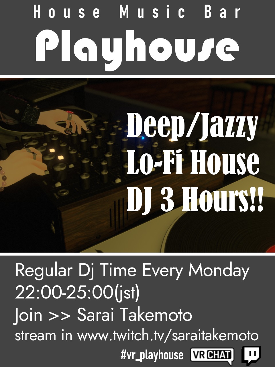 VRChatで毎週開催月曜に開催している嶽本サライによる3時間Deep HouseDJイベントです。配信もあるのでVR外からもご覧いただけます。VRCID Sarai Takemoto にJoinか下記のURLから配信でご覧ください。