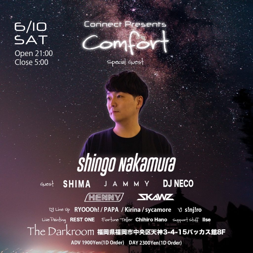 Comfort feat. Shingo Nakamura 福岡県 schedule: 2023.06.10 21:00 lineup: 【Special Guest】Shingo Nakamura, 【Guset DJ】SHIMA (HOUSETRIBE FUKUOKA), JAMMY (Lighthouse), DJ NECO (Analog Journey,HOUSETRIBE DEEP), KENNY (Fukuoka Revo,TRANSONIC), SKAWZ , 【DJ】 RYOOOh!, PAPA, KRINA, sycamore , 【VJ】 s!nj!ro, 【Live Painting】 REST ONE 【占い】 Chihiro Hano 【Support】 Ilse DJ