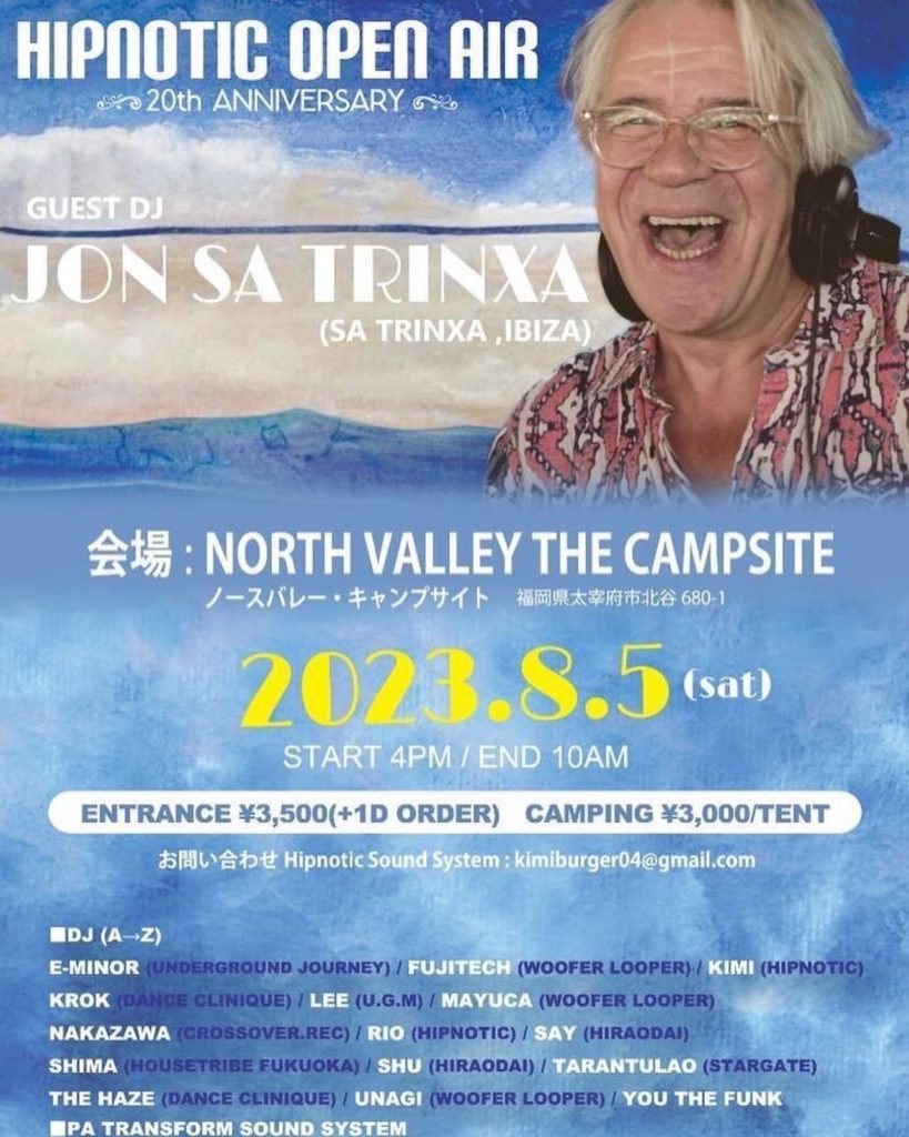 Hipnotic Open Air ~20th Anniversary ~ Guest DJ : JON SA TRINXA (SA TRINXA, IBIZA) 福岡県 schedule: 2023.08.05 16:00 lineup: ■GUEST DJ : JON SA TRINXA (SA TRINXA ,IBIZA) ■DJ (A→Z) E-MINOR (UNDERGROUND JOURNEY) FUJITECH (WOOFER LOOPER) KIMI (HIPNOTIC) KROK (DANCE CLINIQUE) LEE (U.G.M) MAYUCA (WOOFER LOOPER) NAKAZAWA (CROSSOVER.REC) RIO (HIPNOTIC) SAY (HIRAODAI) SHIMA (HOUSETRIBE FUKUOKA) SHU (HIRAODAI) TARANTULAO (STARGATE) THE HAZE (DANCE CLINIQUE) UNAGI (WOOFER LOOPER) YOU THE FUNK DJ