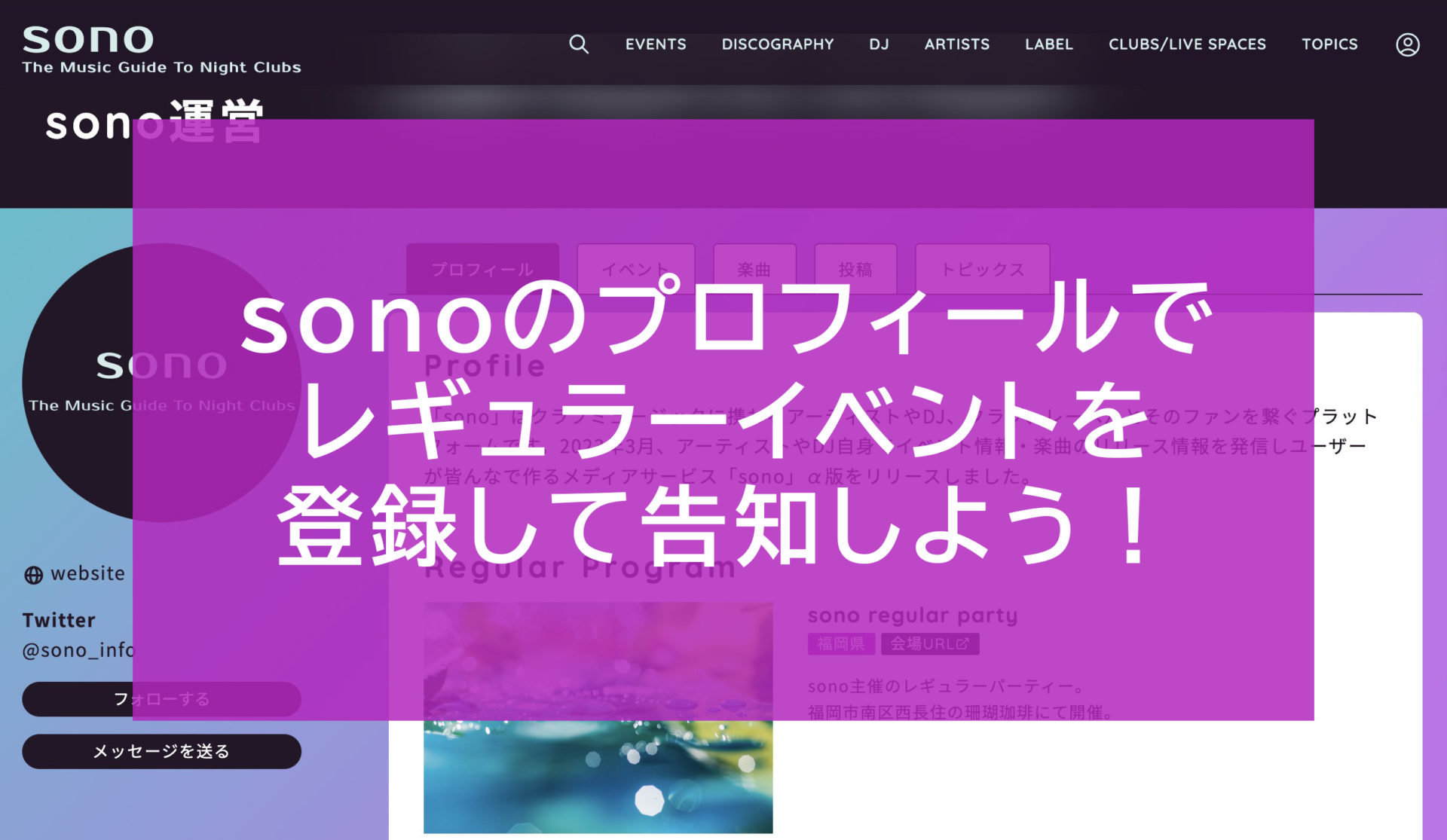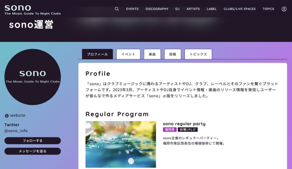 ご存じですか?sonoでアカウントを作成すると、通常のイベント情報の投稿とは別に、定期開催されるレギュラーイベントをご自身のプロフィールページに表示させることができるんです。