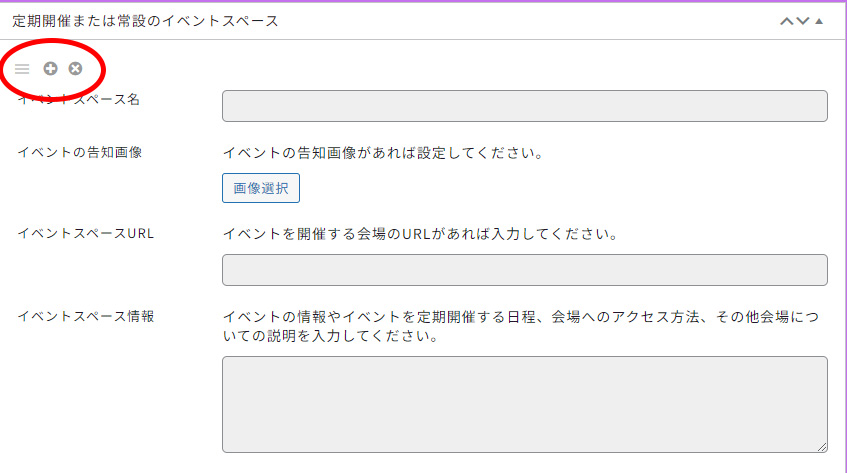 - イベントスペース情報(イベントの情報やイベントを定期開催する日程、会場へのアクセス方法、その他会場についての説明を入れられます)